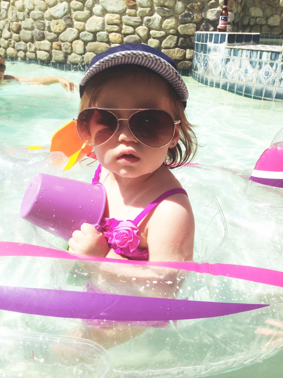 We ended up going to my friend's parent's house to swim and have a couple cocktails by the pool. Berlyn has slowly but surely been getting more and more comfortable around water. The first time she touched beach water she FREAKED. Now she is okay with it, and even more okay with pool water. So we packed up her diaper bag with food, snacks, towels, sunblock, and a baby raft, and we were on our way.